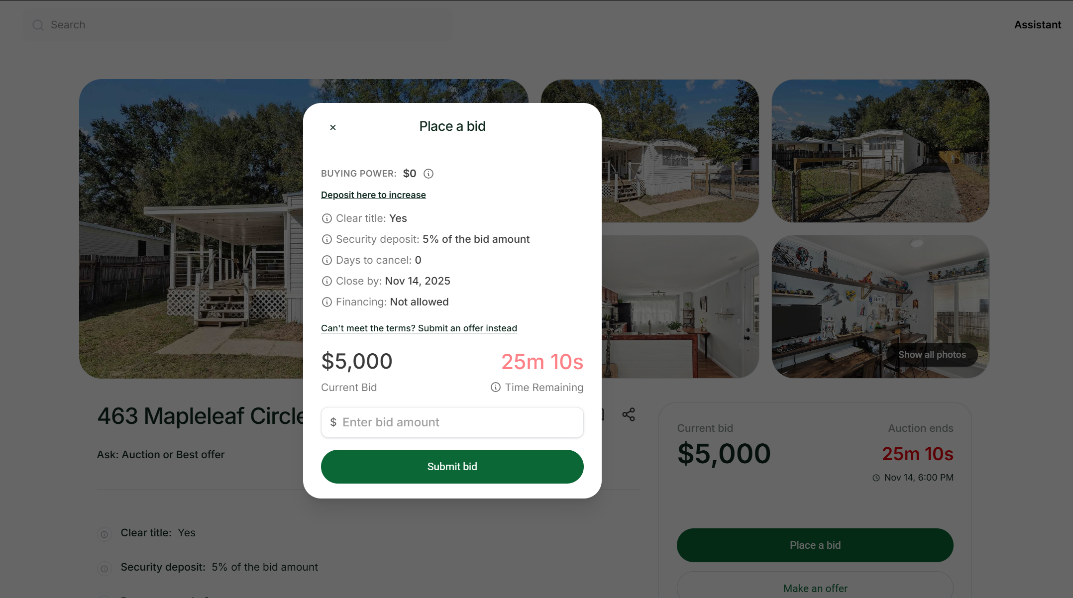 - Auction: View the auction on the Explore page. Just click on the property you're interested to submit bids at any time