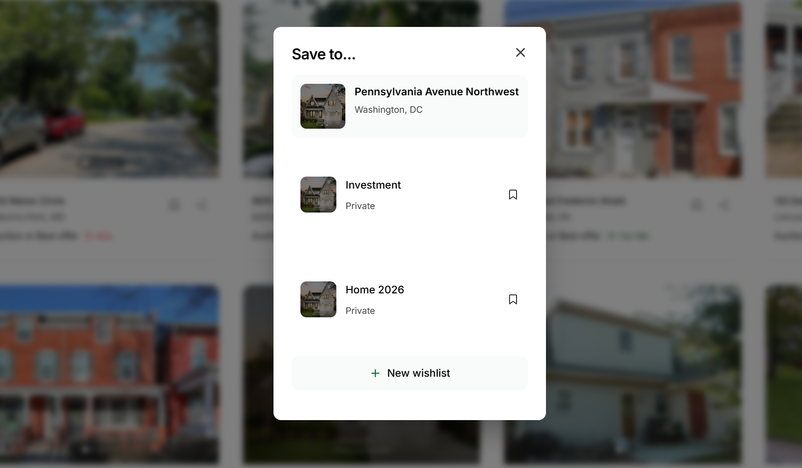 When saving a property, you can choose where it goes: either add it to an existing wishlist or create a new wishlist. Wishlists can be named and organized however works best for you: by neighborhood, favorites, investment options, or homes to revisit.