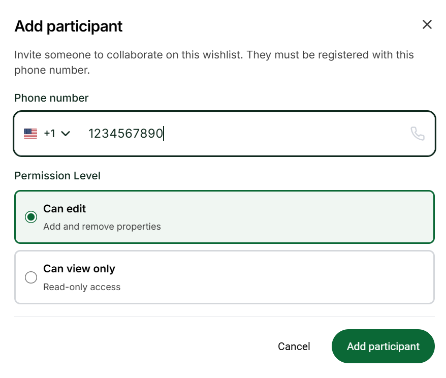 Enter their phone number. The participant must register with the same phone number in order to access that wishlist. Participants can view the properties you’ve saved and stay aligned with your search, and you can also give them access to edit the wishlist.