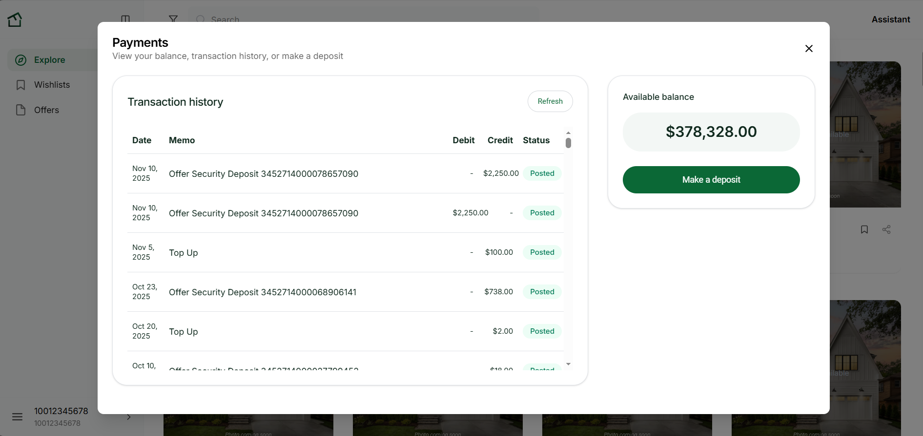 After logging in, click the hamburger menu (☰) at the bottom left corner of the screen and select "Payments". There, you’ll find details about your available balance and a complete history of your transactions, as depicted below: