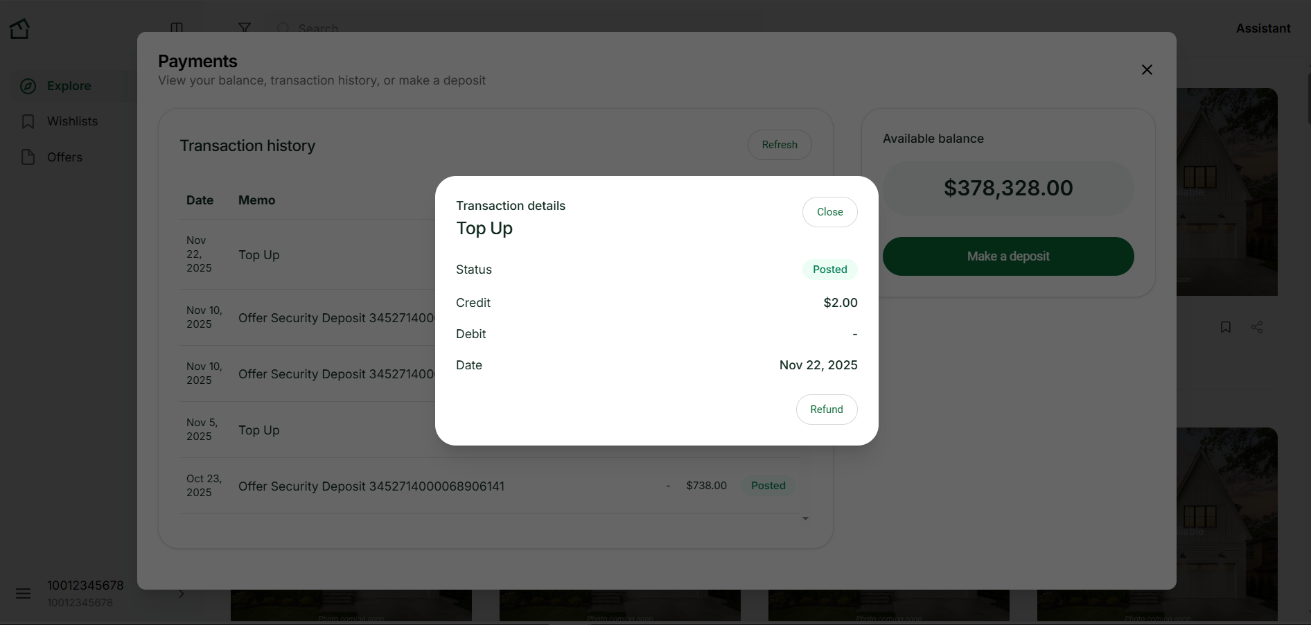 To request a refund, browse through the transaction history and select the specific ledger entry you want to refund. After selecting the transaction, tap "Refund".